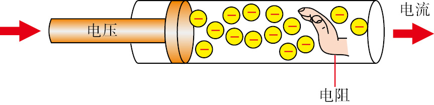 河中的水流遇到石头时会受到阻碍。同样电流在导体中也会受到阻碍。 导体对电流的阻碍作用称为电阻,电阻即阻止电流流动及减缓流动的力 (图1-5)。电阻将电能转换成其他形式的能,如热能、光能或动能。