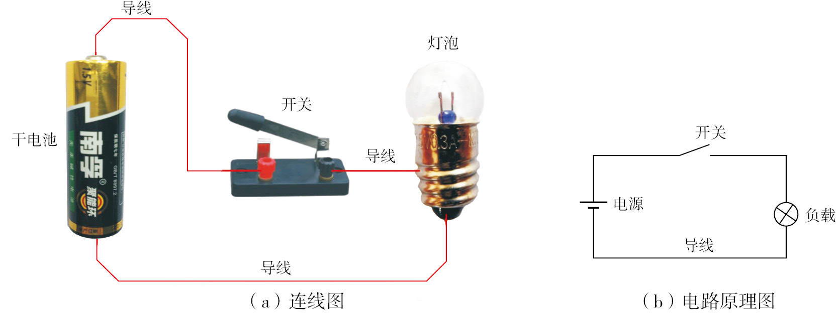 电路是电流流过的路径。 把一个灯泡通过开关、导线和干电池连接起来,就组成了一个简单的电路,如图1-8所示。