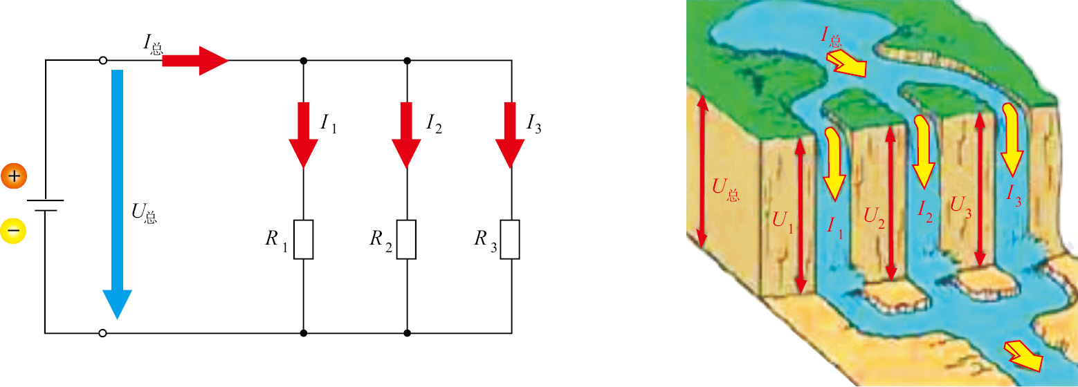 若干个元件首与首连接,尾与尾连接,接到一个电源上,这种连接方法称为并联。一个并联电路有一个以上的电流通路,每个分路的电压相同。假如每个分路的负载电阻相同,分路电流也将相同。假如分路里的负载电阻不同,分路电流也将不同。假如有一个分路损坏, 电流将继续流往其他分路。并联电路也可以用水流来描述,如图1-13所示。