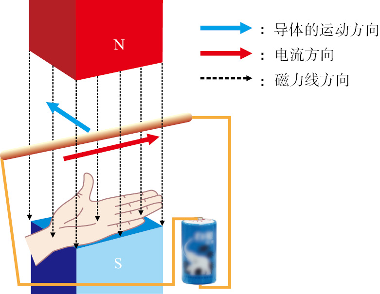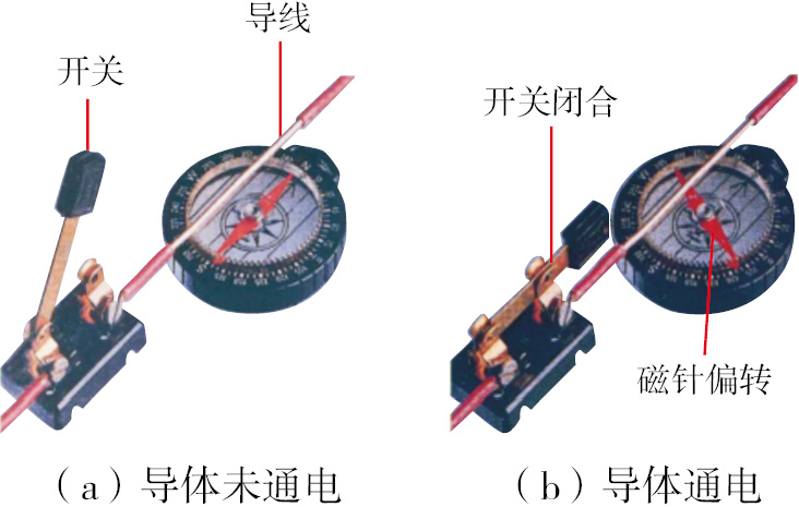 如图1-18所示,把通电导体与指南针(磁针)平行放置,然后接通电源,当导体上有电流通过时,周围产生磁场,使附近的磁针产生偏转。