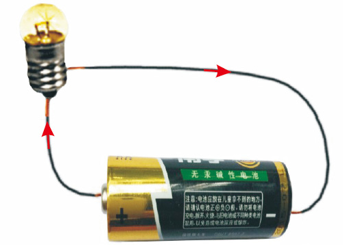 通常规定电流的方向是从高电位(正极)到低电位(负极)。图1-2所示电路的电流方向如图中箭头所示,即 电源正极→灯泡→电源负极。
