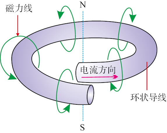 如果把导线做成环状并在导线中通入电流,导线周围会产生磁力线,这时每条圆形磁力线从环形导线的一边进入另一边。换句话说,这些磁力线都穿过环状导线中心,这样就形成了一个带有N极和S极的弱电磁体。这些磁力线从N极离开环形导线,沿环形导线外部流动, 在S极重新进入,就像一块条形磁铁,如图1-20所示。