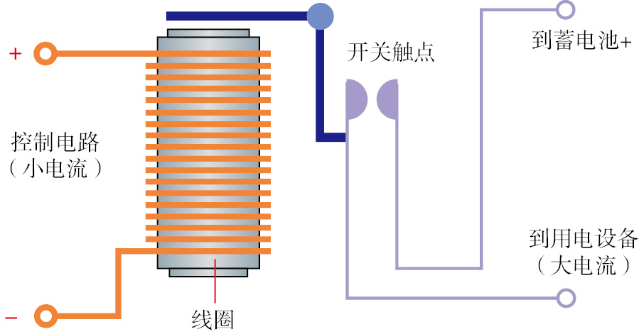 汽车起动机上的电磁开关、启动继电器等就是电流磁效应的典型应用。图1-23所示为电磁开关示意图,一个较小的电流流过绕在铁芯上的电磁线圈,产生电磁吸力使电路触点闭合。然后,开关触点便可能接通大电流到用电设备,即以小电流控制大电流。