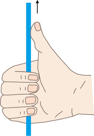 如果给直条导线通电,在直条导线周围会产生磁力线。磁力线的方向可以用安培右手定则(导线)来判定(图1-19): 以右手握住有电流的直条导线,拇指指向电流方向,其余四指的方向即为磁力线的方向。