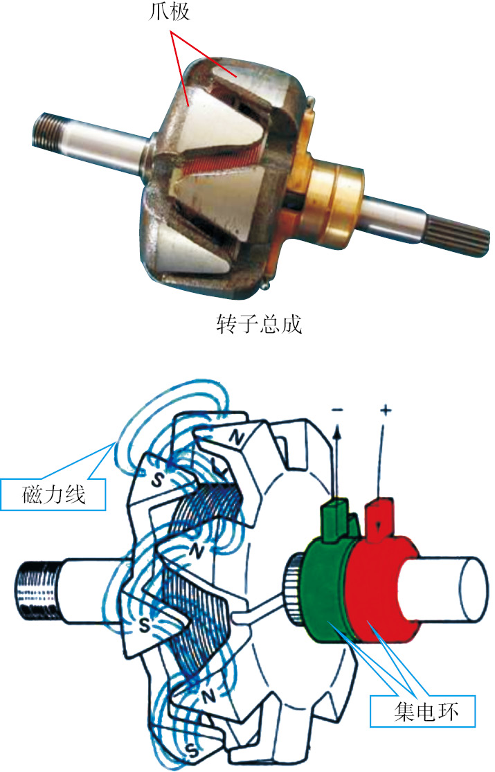 图1-27所示为一个典型的交流发电机转子,转子上绕有励磁线圈,当外电路通过电刷使励磁绕组通电时,便产生磁场,使爪极被磁化为N极和S极。当转子旋转时,磁通交替地在定子绕组中变化,根据电磁感应原理可知,定子的三相绕组中便产生交变的感应电压。