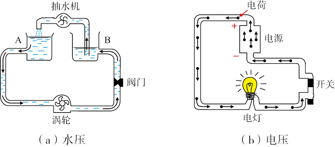 图1-4(a)中水流的形成是由于抽水机给水流提供能量,抽水机的工作使水路存在一个稳定的水压,从而保证水流得以持续。图1-4(b)中电源的作用与抽水机类似,它给电路中的电流提供能量,使电路存在一个稳定的电压,从而保证电流得以持续。电压是使自由电荷发生定向移动的原因,但是当电路无电流流动时,电压依然存在。