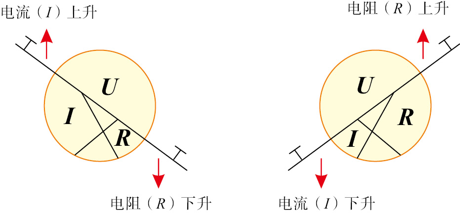 欧姆定律可用图1-6表达。也就是说,如果电阻恒定而电压变化,电流将随电压的增大或减小而(成比例地)增大或减小;如果电压恒定而改变电阻,电流与电阻的变化相反,电阻变大时电流将减小,而电阻减小时电流将增大。
