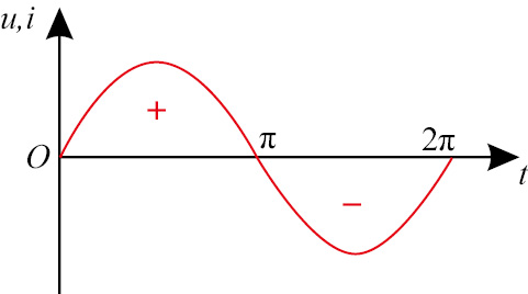 大小和方向随时间改变的电流或电压称为交流电(AC)。如果电压和电流是按周期性正弦规律变化的,则称为正弦交流电。在汽车维修企业中,许多大型汽车维修检测设备是用交流电作为电源的,其波形如图1-15所示。