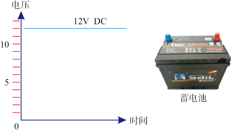 方向和大小均不随时间变化的电流或电压称为直流电(DC)。直流电流可由电池、热电偶、太阳能电池和换向器式的发电机产生。汽车的大部分系统均使用直流电。直流电的优点是可以被储存在蓄电池中。图1-14所示为12V的直流电压。