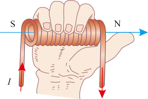线圈磁力线的方向可以用安培右手定则(线圈)来判定(图1-22): 用右手握住线圈,使四指的方向与电流的方向一致,拇指的指向就是磁力线的方向。