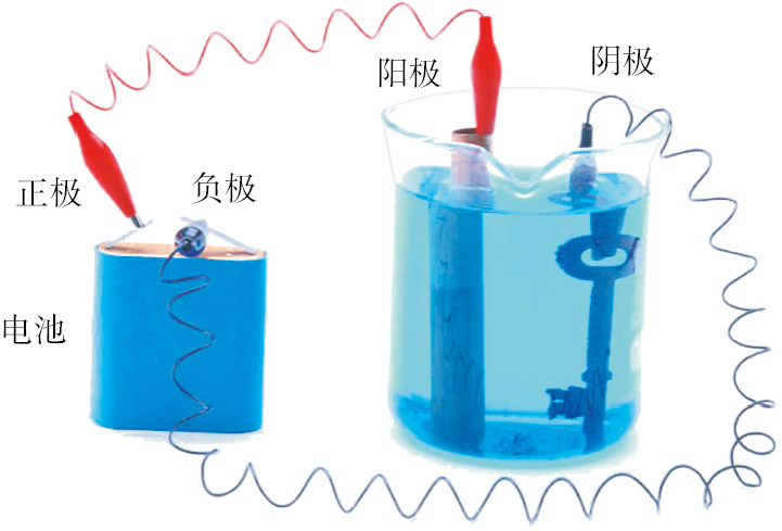 电流通过导电的液体会使液体发生化学变化,产生新的物质,电流的这种效应称为化学效应, 如电解、电镀、电离等。图1-17所示为电解硫酸铜。