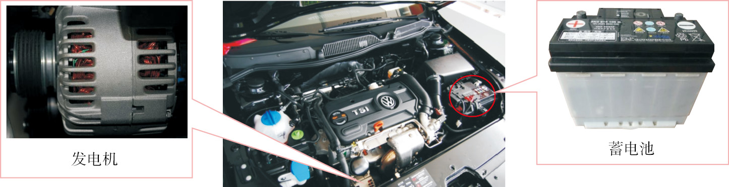 汽车上采用了两个电源,即蓄电池和发电机,它们以并联的方式向用电设备供电。蓄电池是辅助电源,在发电机未发电或电压较低(低于蓄电池端电压)时,由蓄电池向电用设备供电;发电机是主电源,当发动机运转到一定转速后,发电机开始向车上的用电设备供电,同时对蓄电池进行充电以补充蓄电池损失的电能。