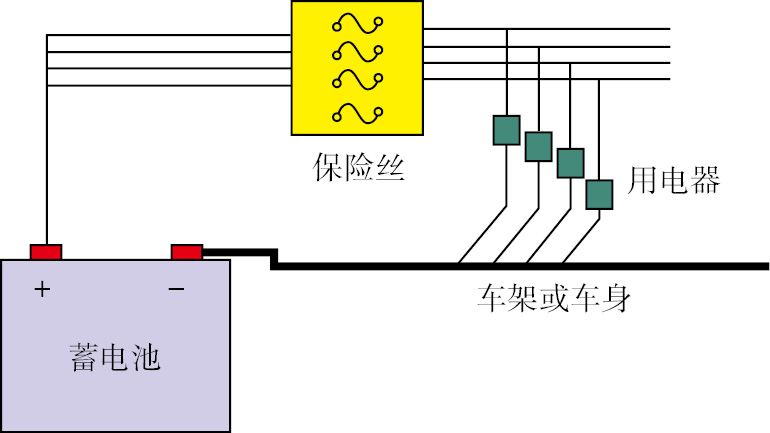 采用单线制时蓄电池的一个电极需接至车架或车身上,俗称“搭铁”。蓄电池的负极接车架或车身称为负极搭铁(图1-141);蓄电池的正极接车架或车身称为正极搭铁。我国规定采用蓄电池负极搭铁。负极搭铁对无线电设备(音响、通信系统)的干扰少,对车架及车身电化学腐蚀小,并且具有连接牢固的优点。目前世界各国生产的汽车大多数采用负极搭铁。
