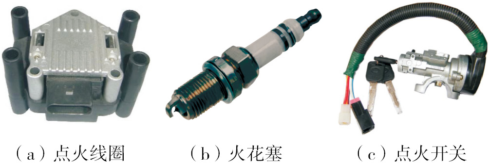现代电控汽油机点火系统由点火线圈、火花塞、点火开关等组成(图1-137)。点火系统的作用是用来产生电火花,适时可靠地点燃气缸中的可燃混合气。