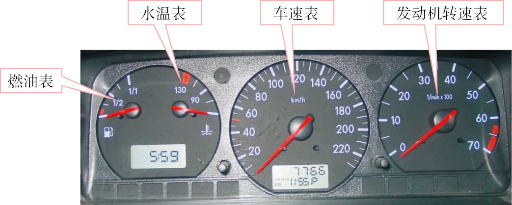 仪表与报警系统主要由组合仪表(包括燃油表、水温表、车速表、发动机转速表等,如图1-139所示)、传感器、各种报警指示灯及控制器等组成。其作用是向驾驶员提供汽车运行的各种参数及异常情况,以确保汽车的正常行驶。