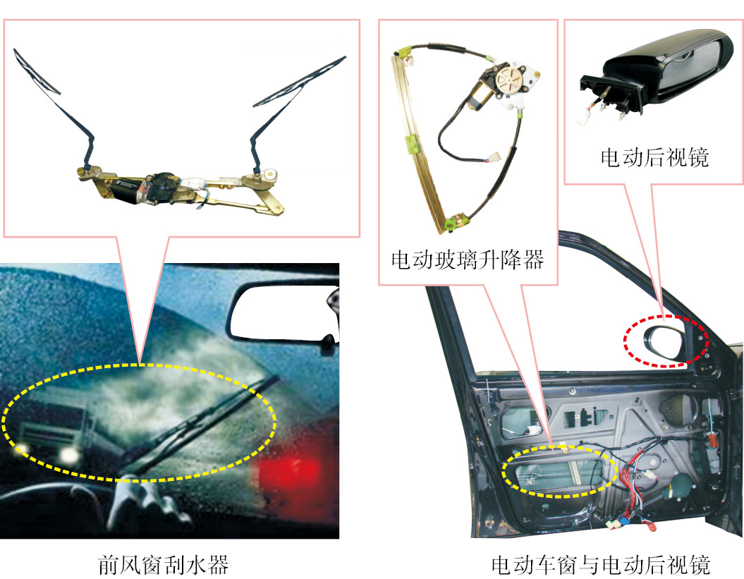 为了提高车辆的安全性和舒适性,目前汽车上普遍使用了许多辅助电器,如风窗刮水器、电动后视镜、电动车窗、电动天窗、电动座椅等装置,常见的辅助电器如图1-140所示。