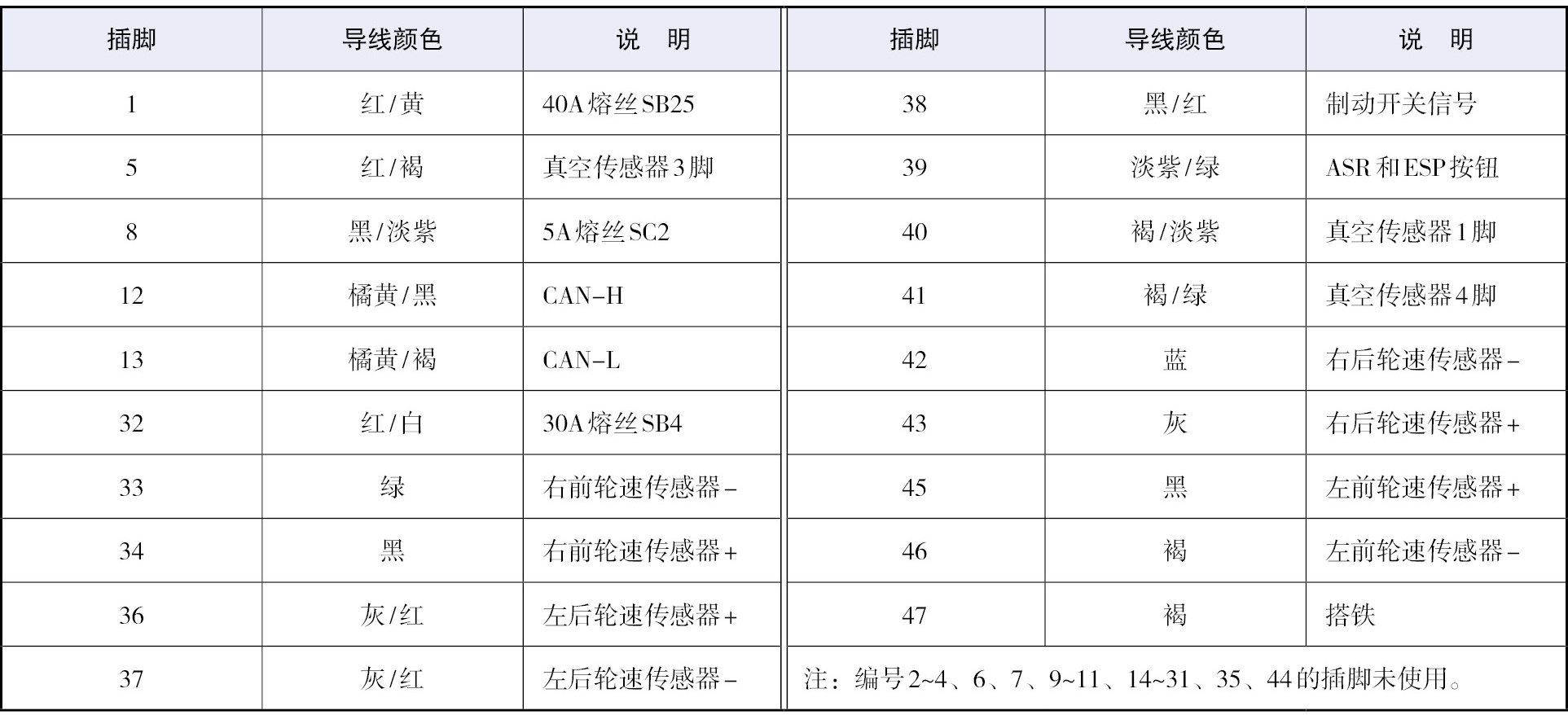 对电子控制系统,在检修时需要知道电控单元各插脚的相关数据,这可以通过对插脚的说明来了解,表1-7所示为一汽大众速腾ABS电控单元连接器的插脚排列说明。