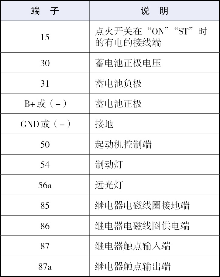 ②电器端子标注 为了方便查找和维修汽车电路,在电路图中用一定数字、字母对电器的接线端子进行了标注(图1-146),了解这些端子的标注,可准确地找到导线和相应的接线端子。各国汽车制造厂家对端子的标注方法不尽相同,表1-6所示为德国汽车电路设备端子的部分标注说明。