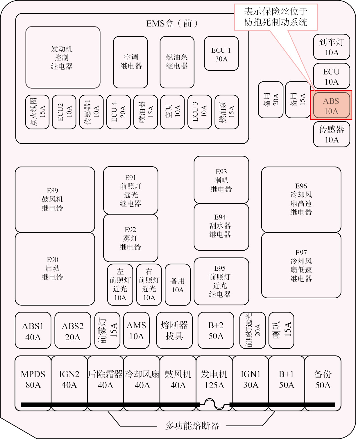 识读过载保护装置定位图方法: 保险丝、继电器及导线的铰接点往往集中安装在保险丝盒、继电器盒及接线盒中,读图时先从电器定位图了解各盒在车上的安装位置,再通过各盒的内部线路图了解盒内的连接关系,在电路图中,保险丝往往采用保险丝所在系统或作用的缩略语加保险丝规格来表示,如图1-158中的“ABS 10A”表示保险丝位于防抱死制动系统,熔断电流为10A,也有的车型采用保险丝编号加保险丝规格来表示,如别克凯越汽车上的“Ef1 30A、Ef2 60A、Ef3 30A等”;继电器在电路图中常常采用继电器所控制电器的名称来表示,如图1-158中的发动机控制继电器、启动继电器、鼓风机继电器等。