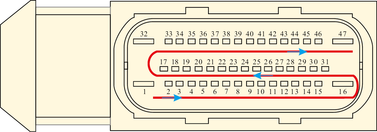 识读连接器的插脚排列图方法: 连接器是一个连有线束的插座,是电路中线束的中继站,连接器上往往有多个插脚,所以必须通过插脚排列图来明确各插脚的连接,从而追踪各条进入该连接器的导线,对于连接器上端子的编号常采用左边为1号端子,由左至右依次增大的编号方法,若连接器上有两排或两排以上端子,则采用由左至右依次增大的“S”形端子编号方法,如图1-160所示,汽车电路图中常采用连接器代码加连接器端子编号的方法来表示连接器上的端子,如图1-161所示一汽大众速腾ABS电控单元电路图中的“T47/41”表示连接器代码为T47上编号为41的端子,代码相同的连接器为同一连接器,也有采用把相同的连接器用虚线框起来或用虚线连起来的表示方法,如图1-162所示。