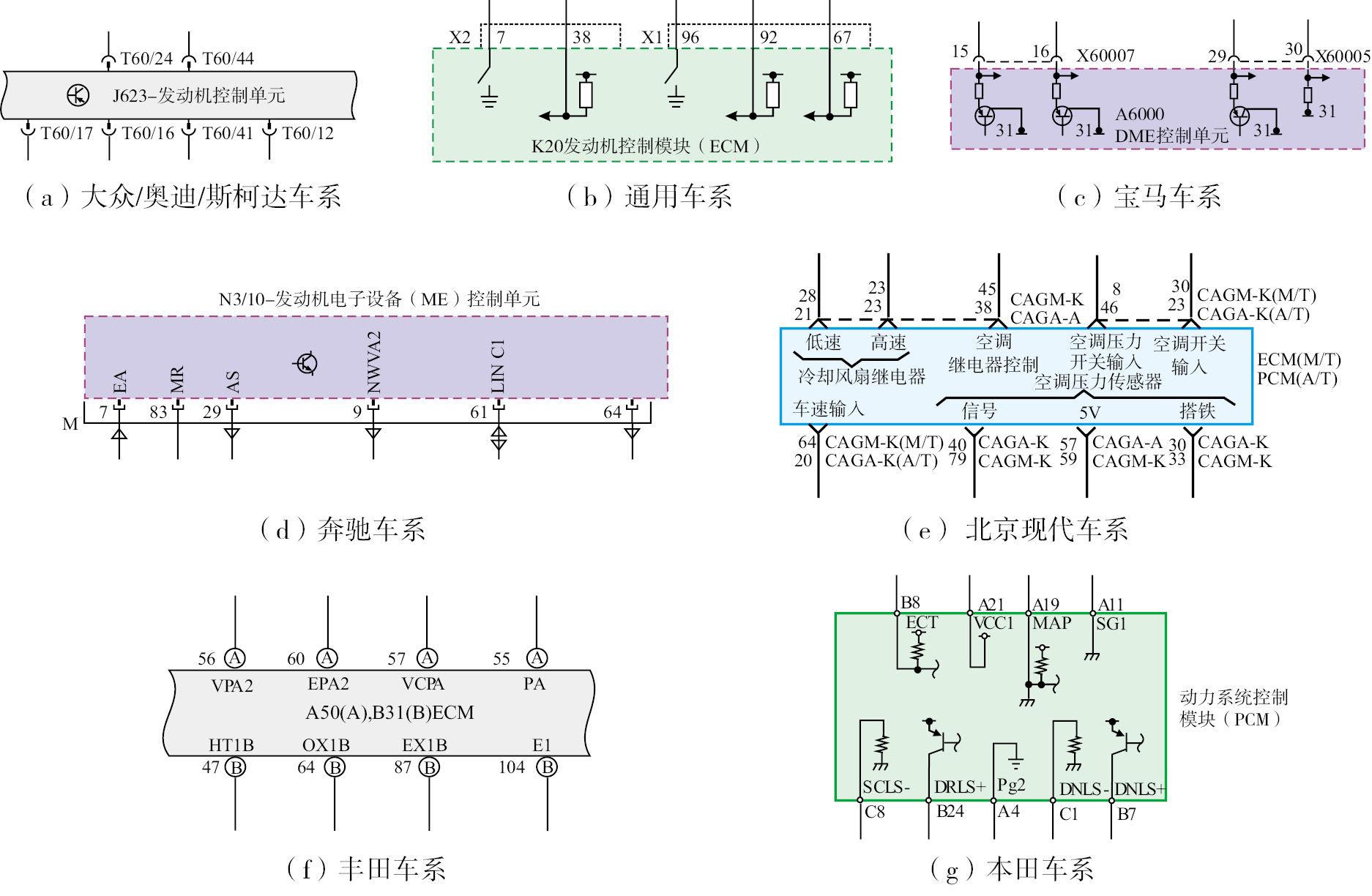 ①电气符号 汽车上所有的电器在电路图中都是用电气符号来表示的。电气符号是简单的图形符号,只大概地表示出电器外形,在图形符号上或旁边用文字加以说明电器名称。各汽车生产厂家绘制的电气符号各有不同,有的是简单的,有的是复杂的。如图1-144所示为发动机电控单元的符号,图1-144(a)是大众/奥迪/斯柯达车系的符号,它是最常见的发动机电控单元的符号;图1-144(b)、(c)分别是通用车系和宝马车系的符号,在电控单元处画出了简单的内部电路;图1-144(d)是奔驰车系的符号,在电控单元处用英文字母标明该端子的作用,并用箭头符号标明信号是输入还是输出;图1-144(e)是北京现代车系的符号,在电控单元处标注出了信号的名称和类型,从图中可以看出是供电、搭铁、输入信号还是控制信号;图1-144(f)是丰田车系的符号,在电控单元处用英文字母标明该端子的作用;图1-144(g)是本田车系的符号,在电控单元处画出了简单的内部电路并用英文字母对端子进行了标注。