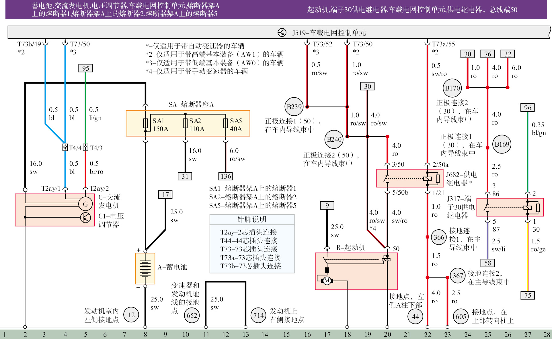 整车电路原理图是一幅完整的全车电路图,能反映全车电路各系统之间的相互关系。在此图上能建立起电位高、低的概念。其负极搭铁电位最低,可用图中的最下面一条线表示;正极电位最高,用最上面的那条线表示。电流的方向基本都是由上而下,路径是电源正极→开关→用电器→搭铁→电源负极。