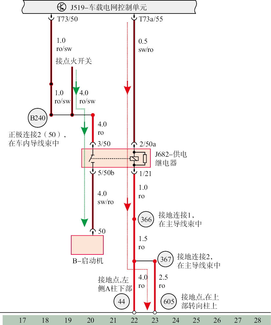 b. 蓄电池或发电机的电流是通过什么路径到达这个开关的,中间是否经过其他开关和保险丝,控制开关是手动按钮还是自动控制的。