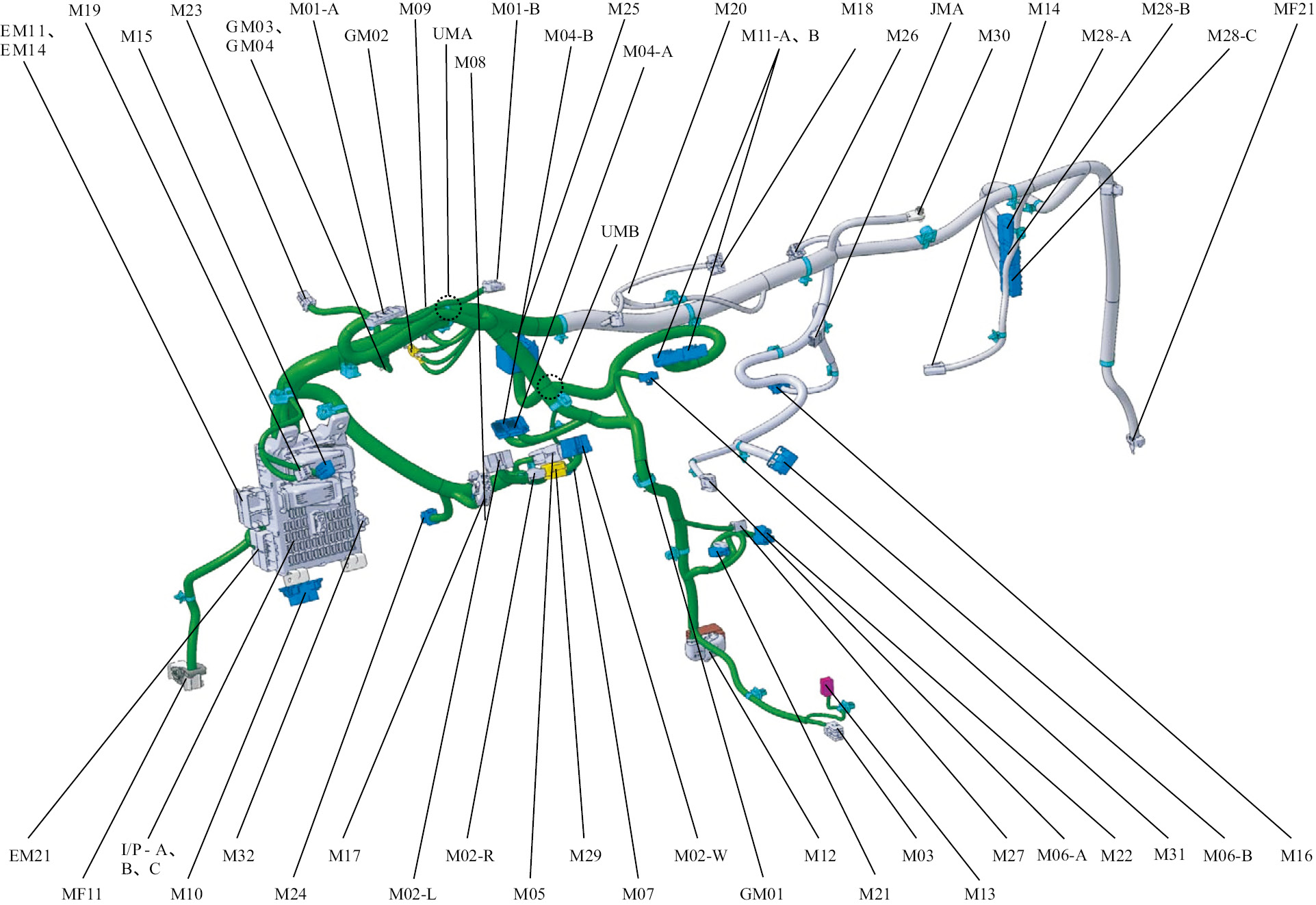 线束图表明了电路线束与各用电器的连接部位、接线柱的标记、线头、插接器的形状及位置等,是人们在汽车上能够实际接触到的汽车电路图。从线束图中可以了解到线束的走向,并可以通过露在线束外面的线头与插接器详细编号或字母标记得知线束各插接器的位置。线束图常用于汽车制造厂总装线和修理厂的线束连接、检修、配线和更换。