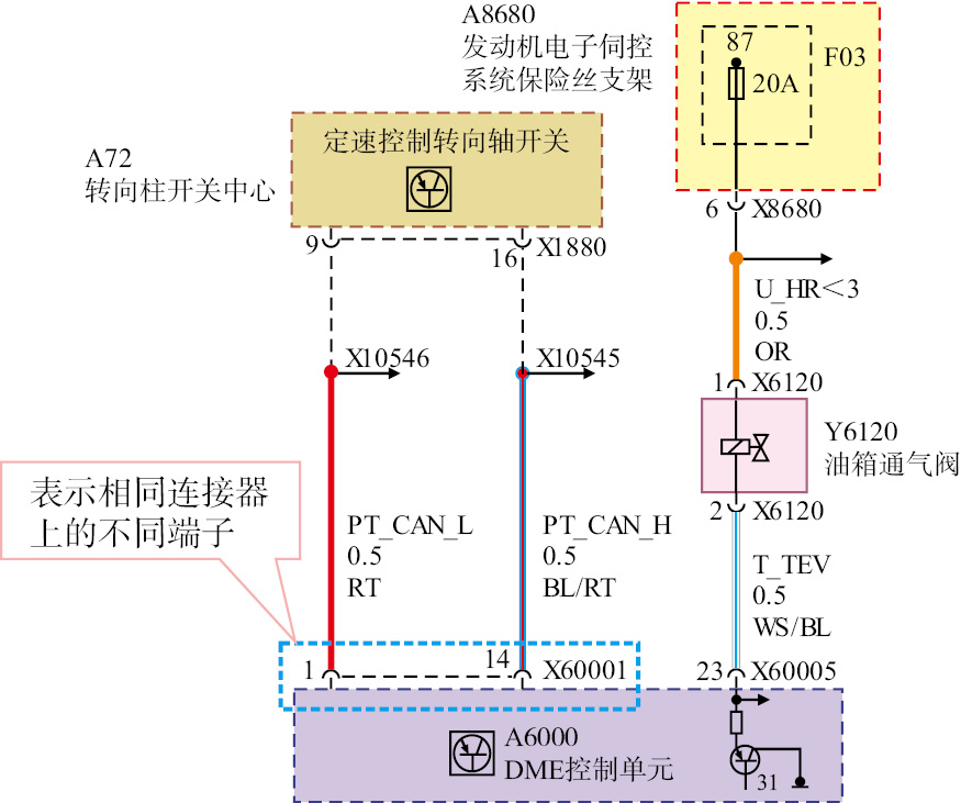 b.找出该系统给ECU供电的电源线有哪些,注意一般ECU都不止一根电源线,弄清楚各电源线的供电状态(如常火线或开关控制)。