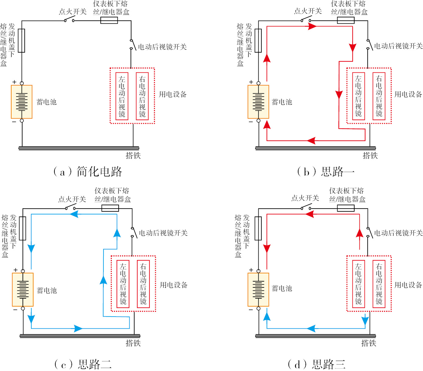 思路三: 从用电设备开始,依次查找其控制开关、连线、控制单元,到达电源正极和搭铁(或电源负极)。