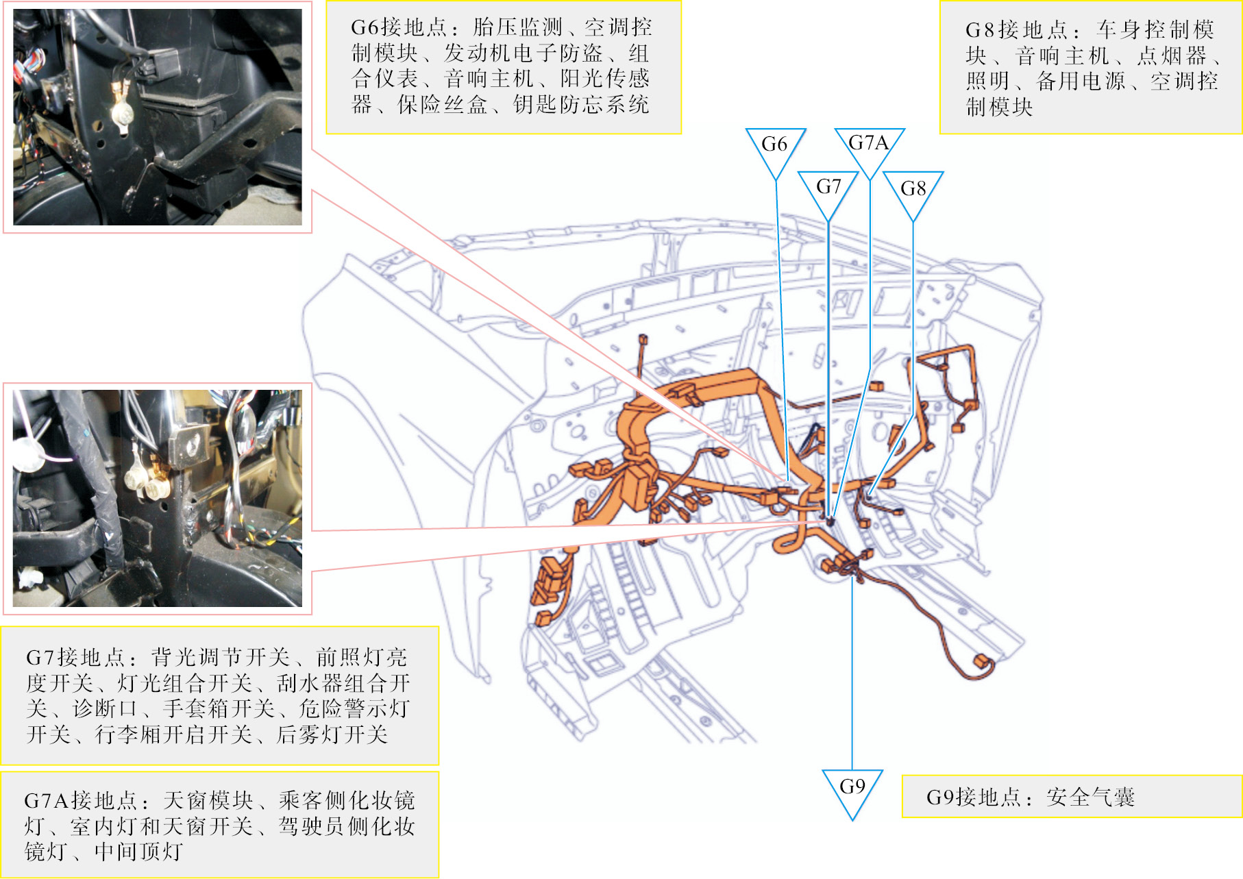 识读接地点位置图的方法: 在电路图中,电路的接地点往往采用字母加数字的编号方法,在接地点位置图中,按编号即可找到相应的接地点,如图1-159中的G6、G7等。