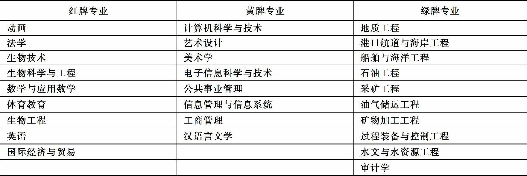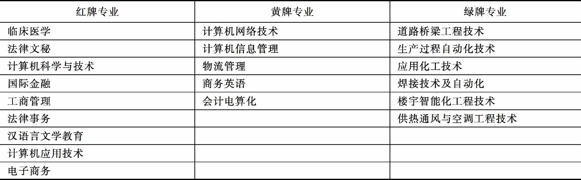 注:红牌专业很难就业,黄牌专业比较难就业,绿牌专业容易就业。