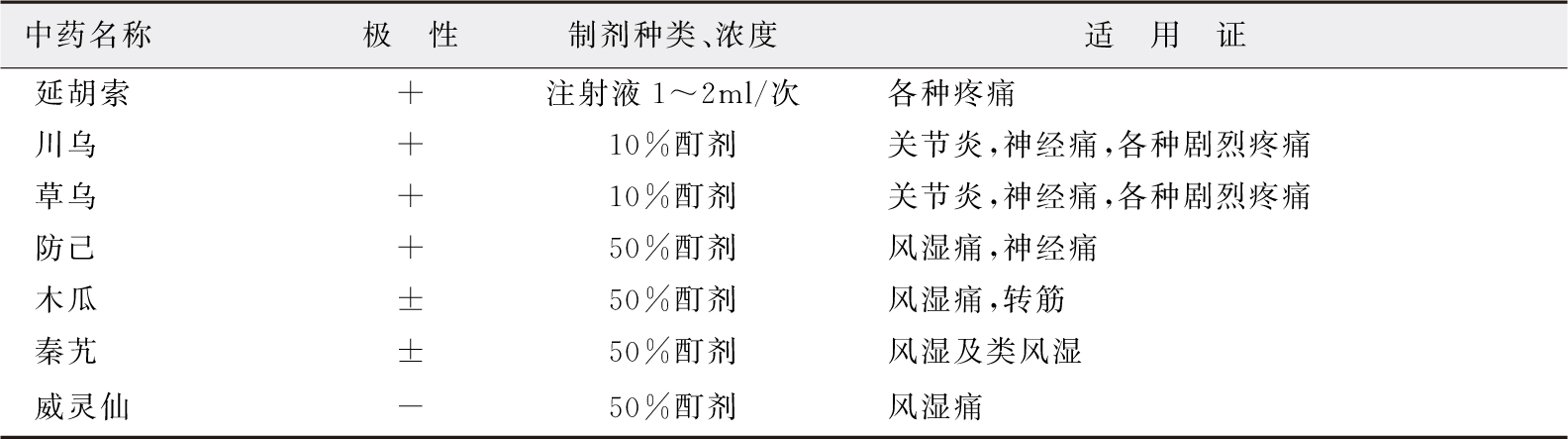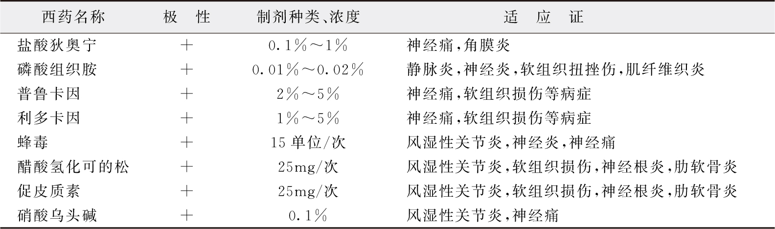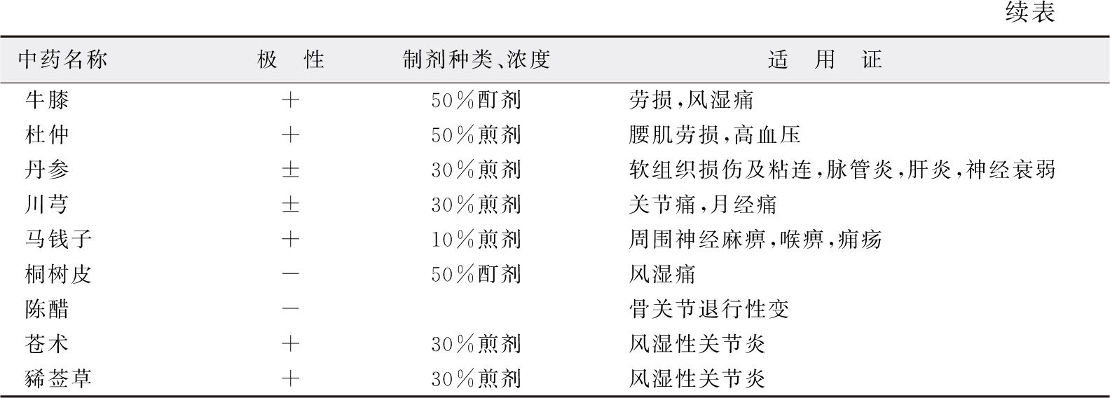 中药离子导入疗法在各种疾病的应用很广泛,根据中药的不同功效而有不同的适应证。常用中药种类及适应证见表2-1。