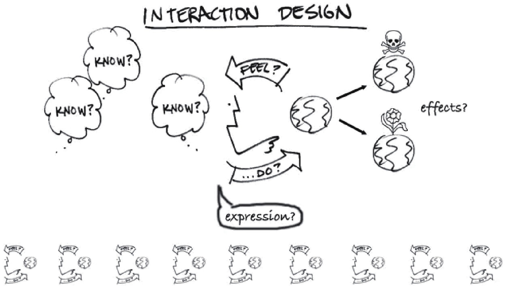 广义地说,这种设计互动的概念,可以运用在人与人、人与信息、人与数字软硬件产品,或是人透过科技与其他人沟通的各种互动模式。也就是说,设计客服流程、设计数字信息平台、设计手机或者设计一个国际通信网路,都必须运用到interaction design的概念。