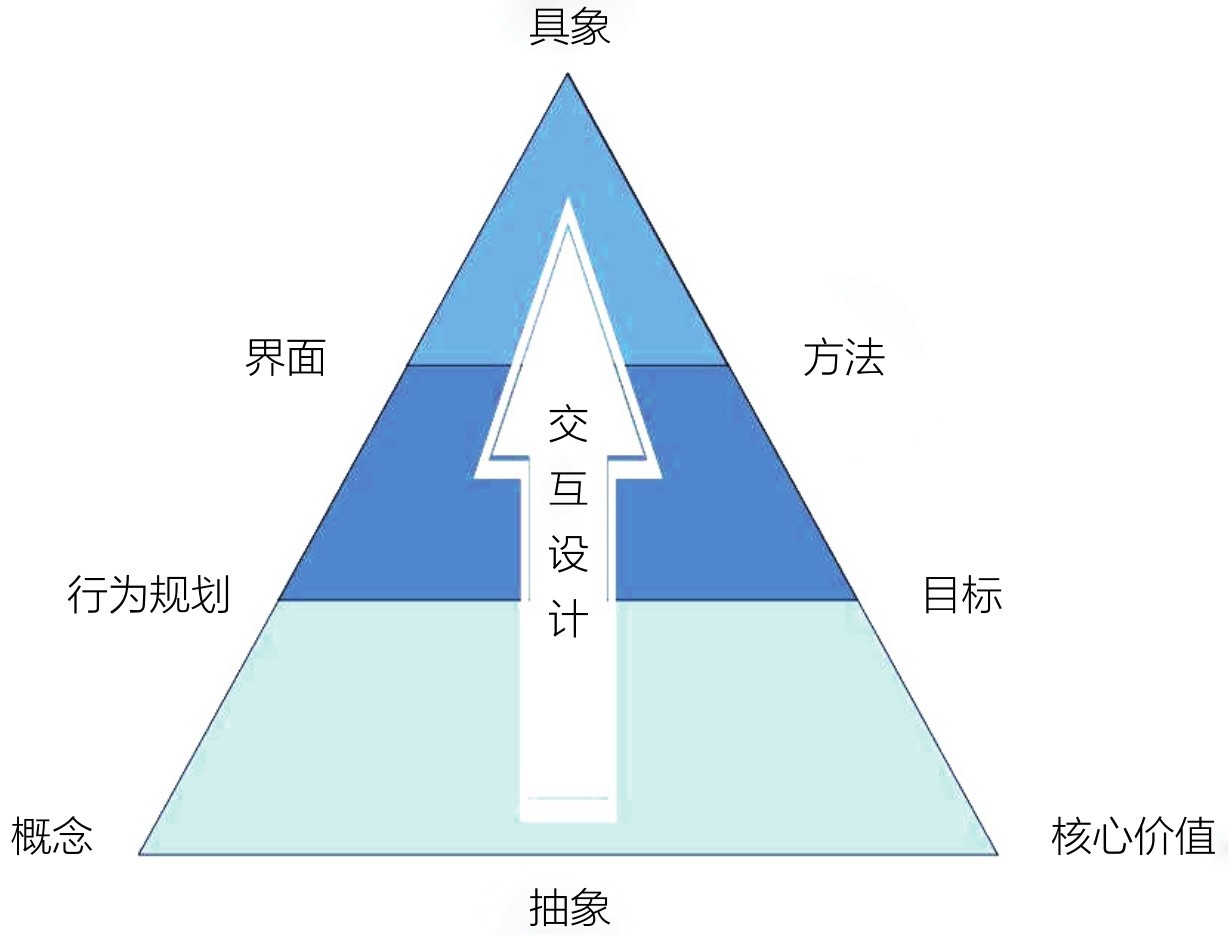 界面的基本定义,就是使用者(user)与系统(system)的接触面,使用者必须透过这个表面来理解和操作系统,系统也必须透过这个表面来向使用者传达信息。因此不管你如何称呼它,界面设计所聚焦的重点都是在这个表面的构成,而且它通常是设计互动过程中最后一个关键环节。曾经在一个讨论交互设计的部落格看过一个不错的图示,以非常简单的方式说明了界面与交互设计的对应关系。由图1.10我们可以看出,界面是交互设计的具体呈现,而整体设计从最初的抽象概念出发,一直发展到最后的具体的界面,其间的整体过程都必须以交互设计观念和思考为轴心。