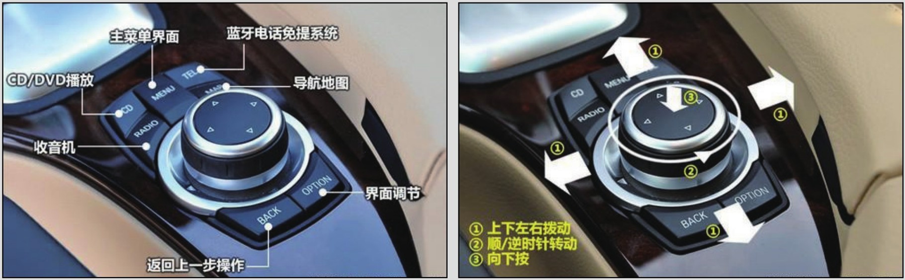 2009年的iDrive系统操作起来更加方便(图2.23),控件由7个快捷键和1个旋钮组成,快捷键各司其职负责进入相应的界面,只要熟悉一下各个按键的位置就能很方便地使用了,这就避免了老款系统从导航想切换到音响时需要很繁琐操作的问题。而旋钮用于在系统的各个界面间切换。