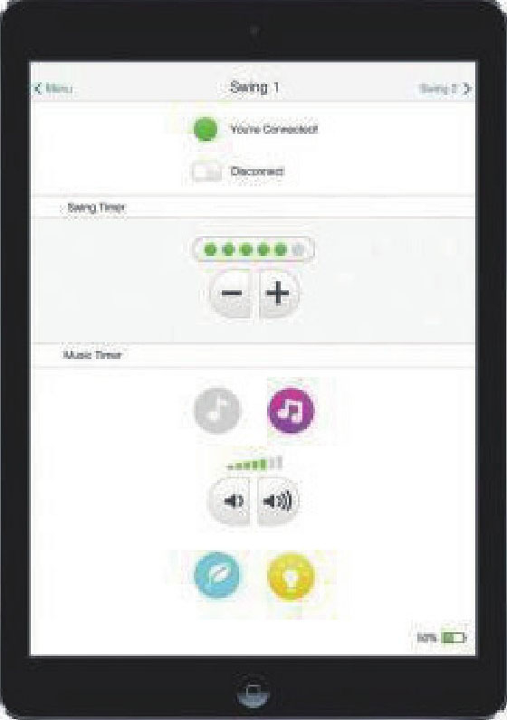 如果你的小宝宝入睡困难,除了摇晃还需要其他辅助条件才能入睡,这款Fisher Price摇椅也有办法。它配有16首歌曲、三个自然安抚音以及嘘声,可以帮助婴儿快速入睡(图2.16)。这些音频的播放也能够通过智能手机上的应用程序进行操作,还可以搭配睡眠计时器使用。此外,如果需要其他音乐还可以直接从相配套的应用程序中选择播放;同时,这款Fisher Price智能摇椅的顶部还配有三个可以发光的小鸟,能够在一定程度上起到安抚小宝宝的作用。
