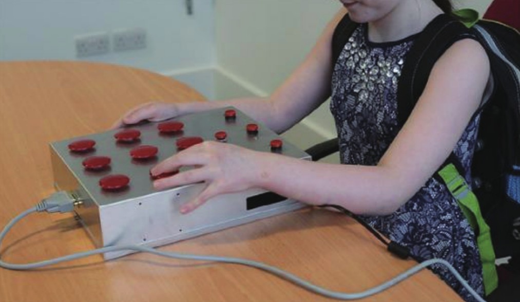 这款Smash-a-ball游戏装置有些像我们熟悉的打地鼠游戏,同时还包括了一个可穿戴背包,用来给孩子提供触觉反馈。Smash-a-ball要求用户玩时必须依赖从盒子里发出的音频信号,然后孩子们必须复制匹配的按钮进行相应的操作,其界面设计如图2.26所示。