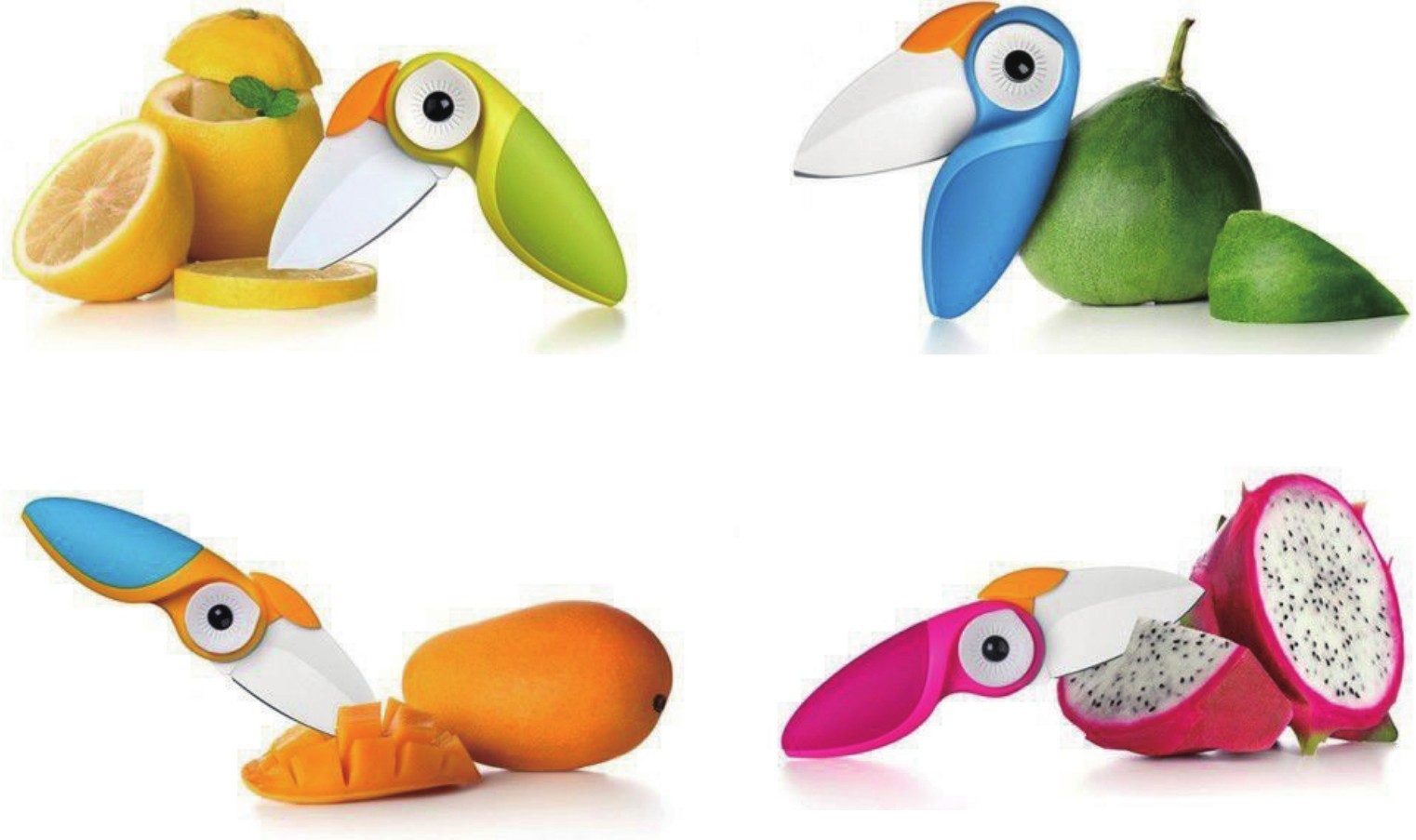在生活中,随手可用的都是一些小东西。作为使用者,当然希望这些便捷之物,或精致,或可爱,或好用,或全能。这款鹦鹉水果刀(图2.17),折叠时状如小鸟。身体每个部分都有舒适体验,刀柄下凹,可稳稳握住,鸟嘴配件,用力时毫无硌手感。体积虽小,颜色鲜艳,在众物中可脱颖而出。