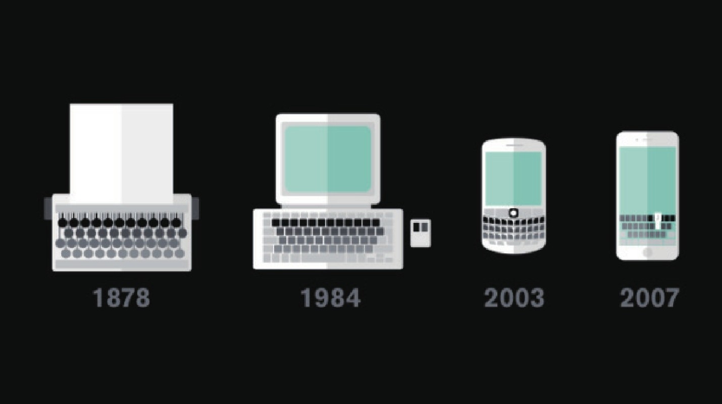 这项科学创新在引入了迎合人类手指头形状的专利弯曲键帽之后则更显人性化。这就是人类早期交互设计的典范,这个几近完美的设计历经140年从未发生改变。如图1.2所示,从1878年生产的雷明顿2号打字机到1984年第一代苹果Macintosh个人计算机到2003年黑莓推出的全键盘智能手机再到2007年苹果第一代iPhone智能手机的虚拟键盘。尽管打字机看起来是一个概念更为抽象的设备,但是其设计内核中所洋溢出来的那种自然、人性、简单和感性的特质的确值得大家学习、领会并在今后的设计工作中融会贯通并加以应用。