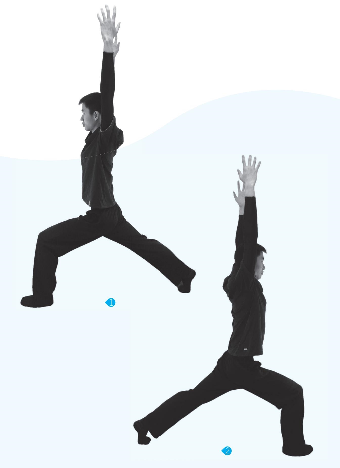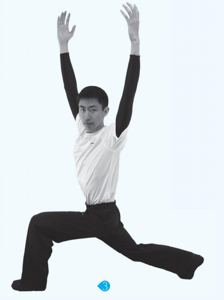 成弓步姿态,双臂头顶方向上举,上身左转,极限位置保持3~5个呼吸。