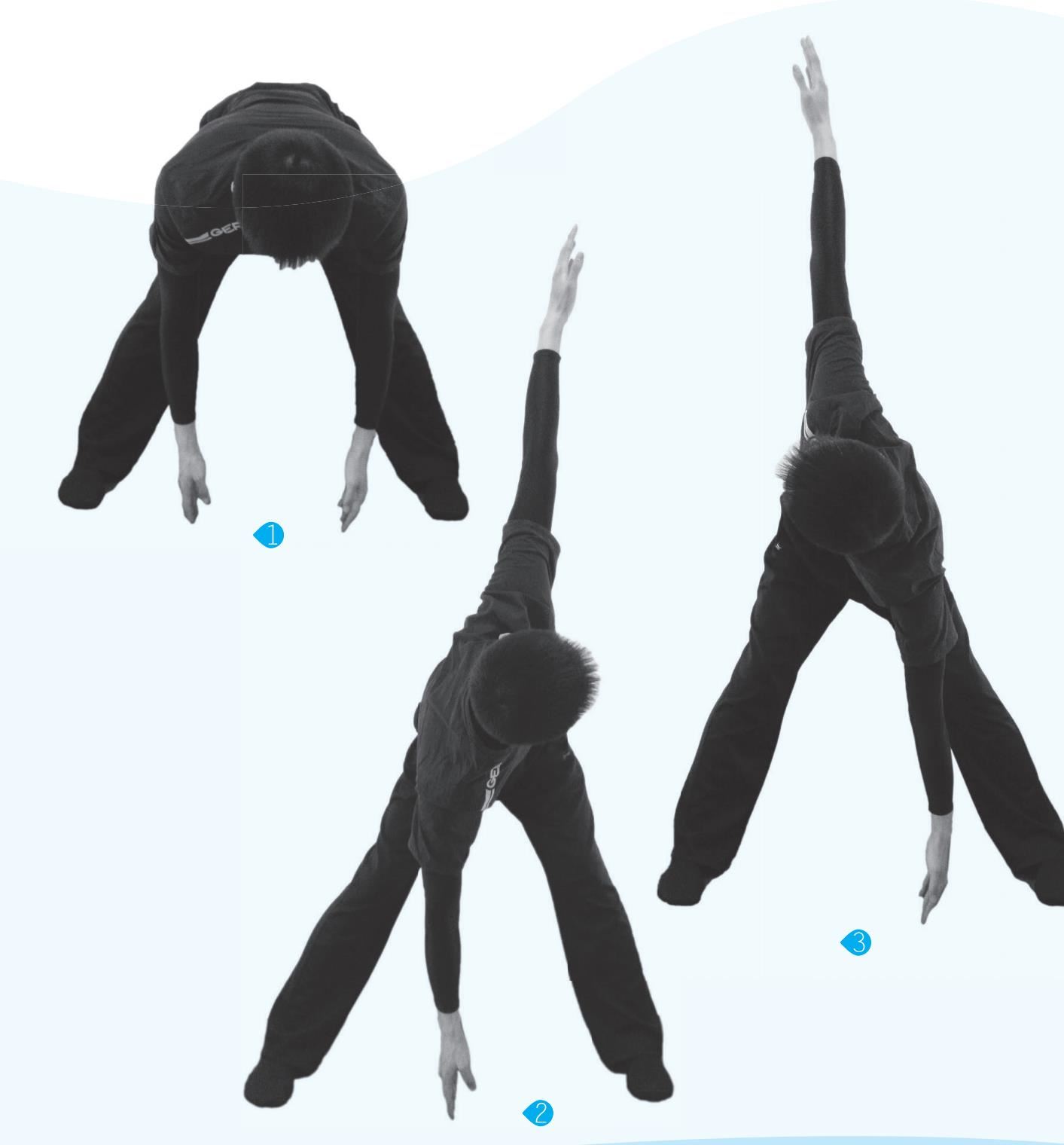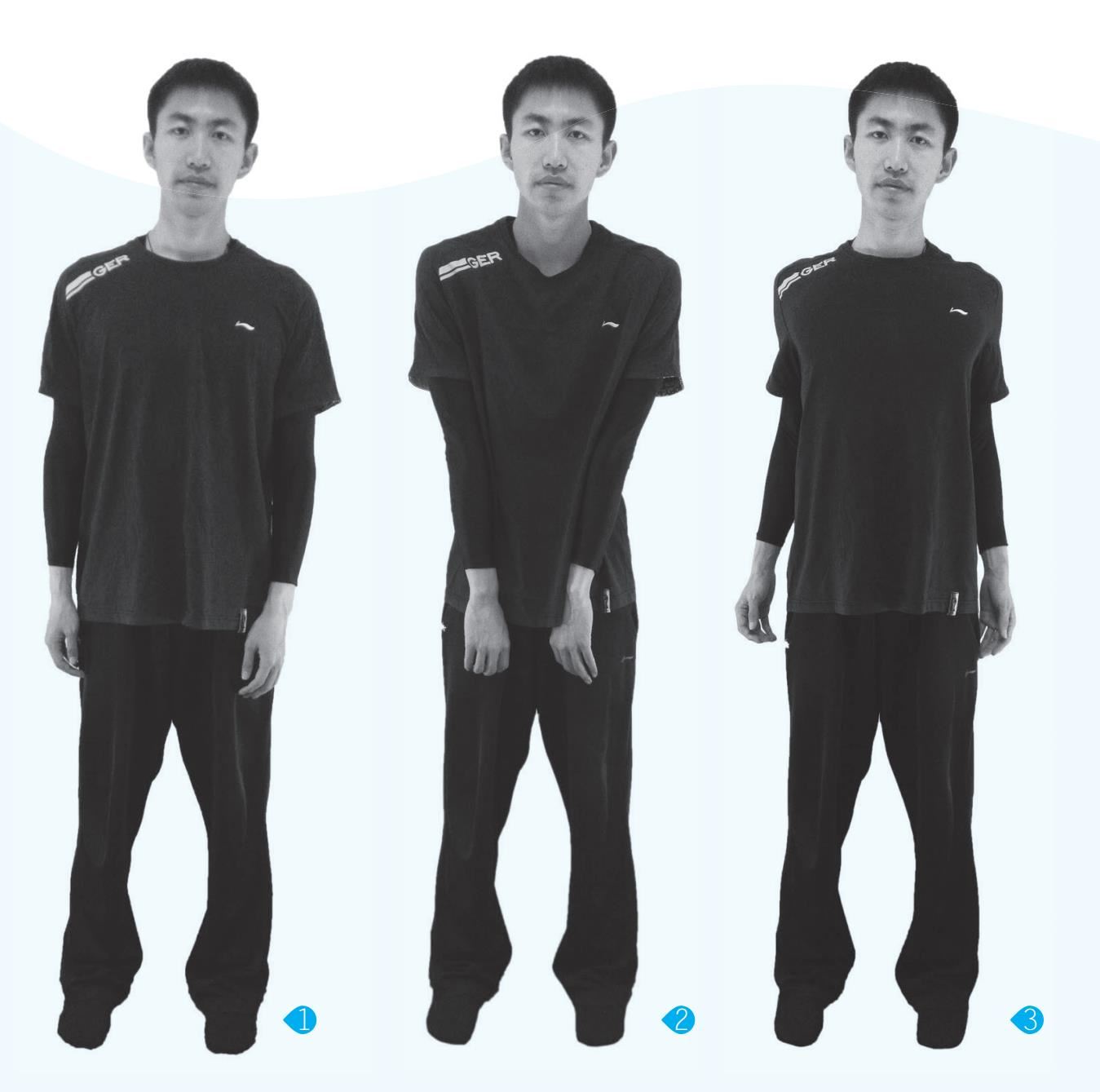双腿开立,头慢慢向左倾倒,至极限位置保持3~5个呼吸;再慢慢向右倾倒,至极限位置保持3~5个呼吸。