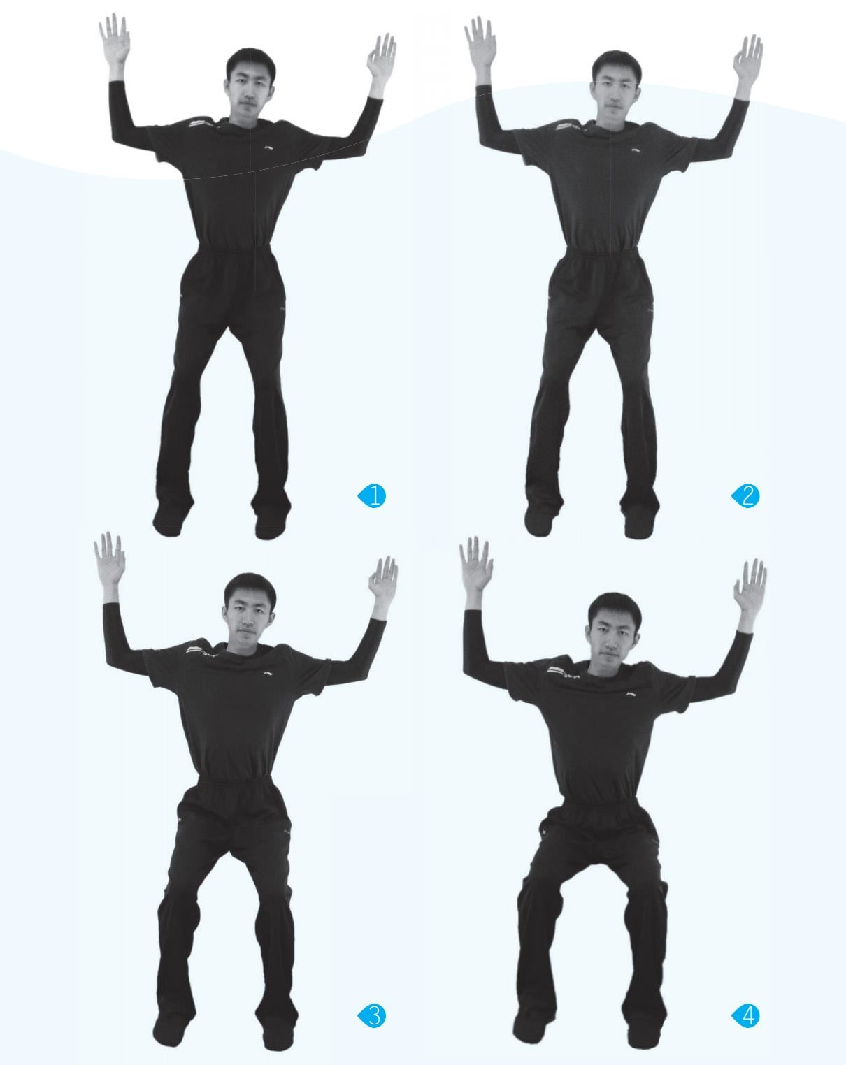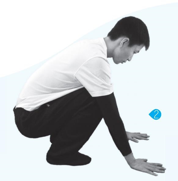 身体重心逐步下降,尽量做到大腿与地面平行,极限位置保持3~5个呼吸。