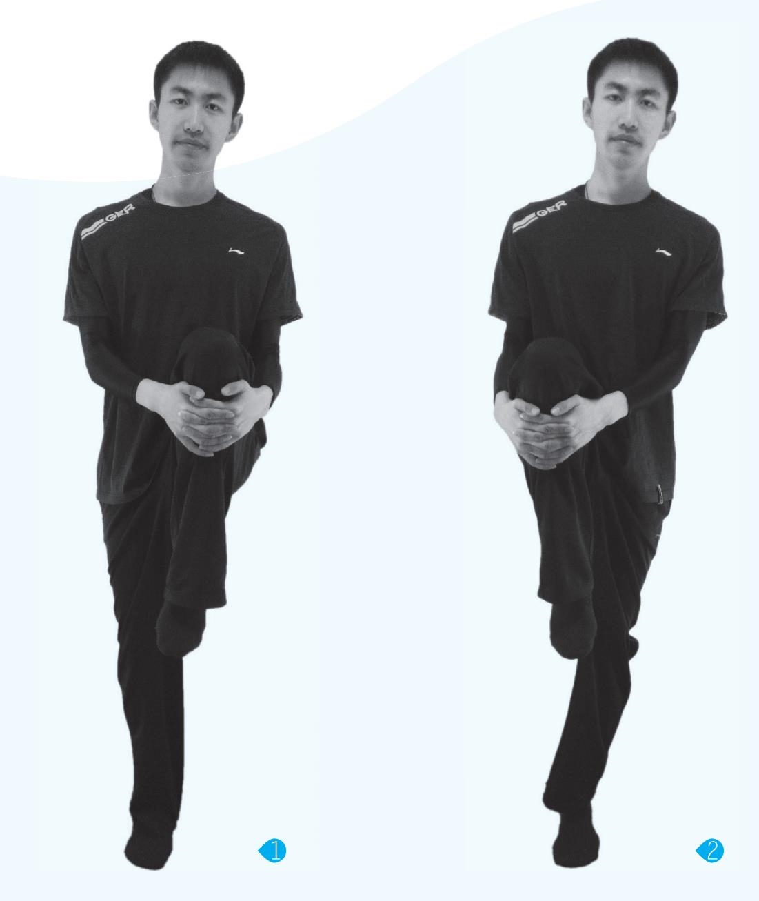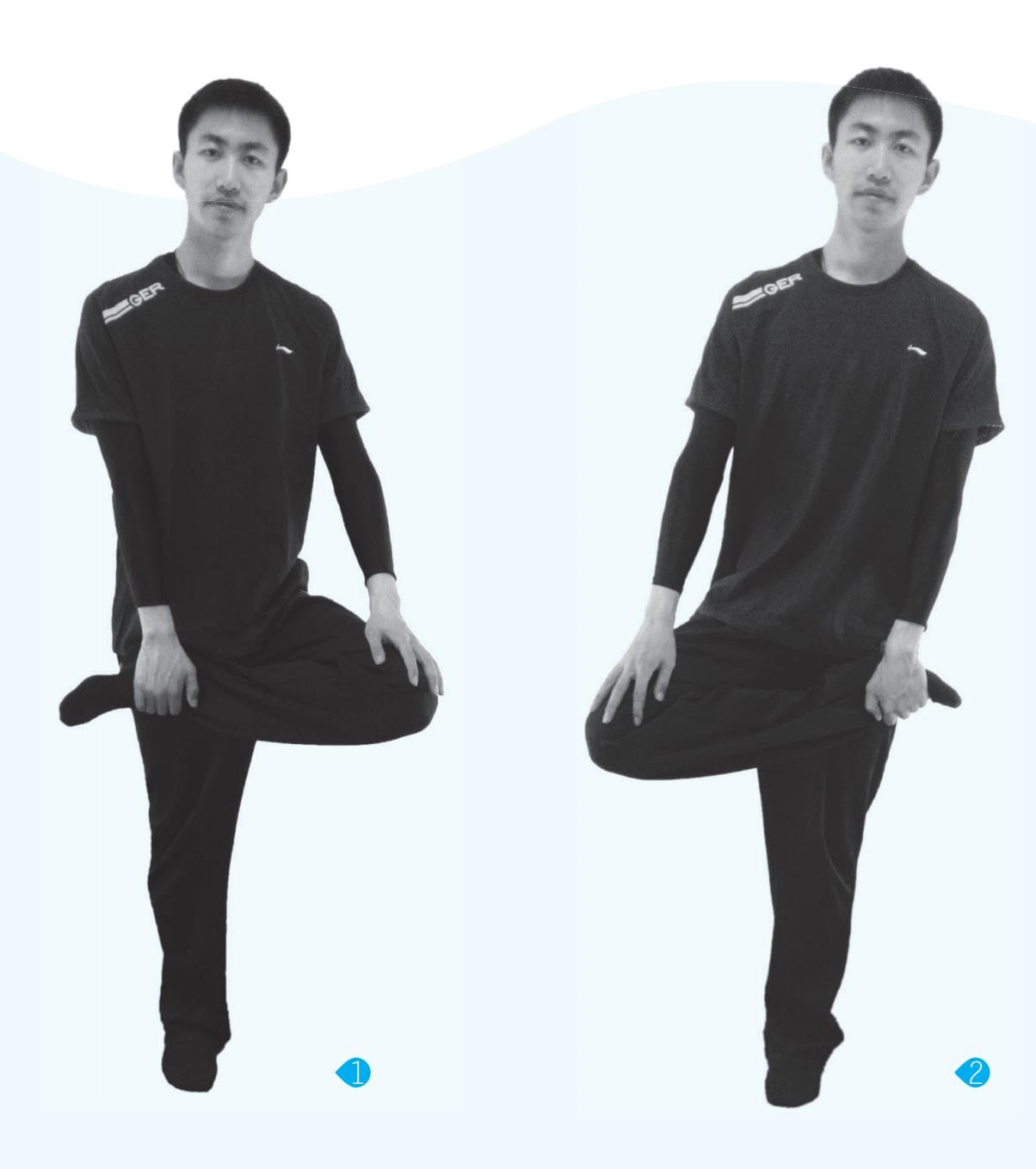 身体直立,左腿屈膝提起,尽量做到大腿与地面平行,双手辅助抓住膝关节。身体姿态平衡时保持3~5个呼吸。
