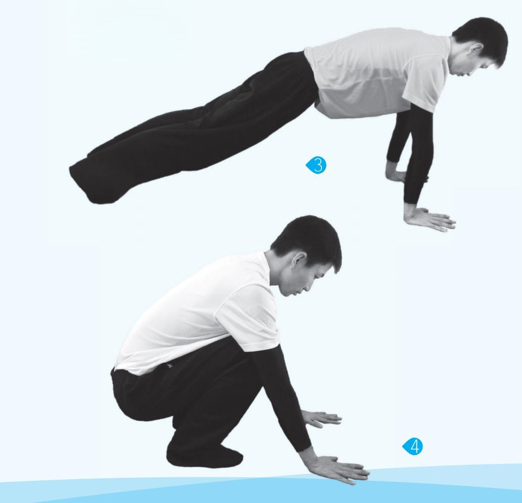 身体从直立姿态下蹲,双臂撑地,双腿后跳伸直,双腿蹬地跳回,再从下蹲转为直立姿态。