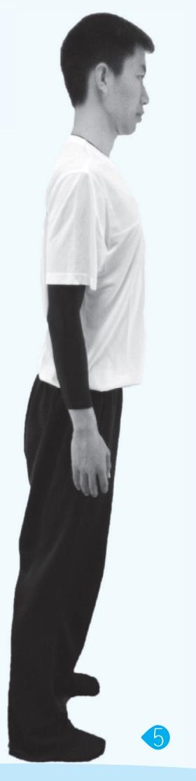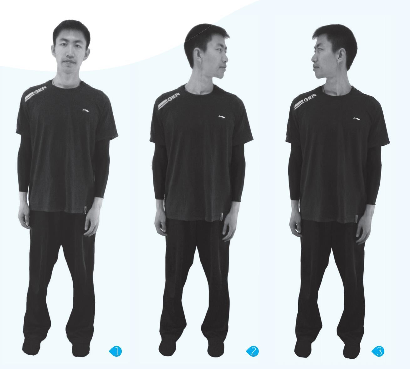 双腿开立,头慢慢左转,至极限位置保持3~5个呼吸;再慢慢右转,至极限位置保持3~5个呼吸。
