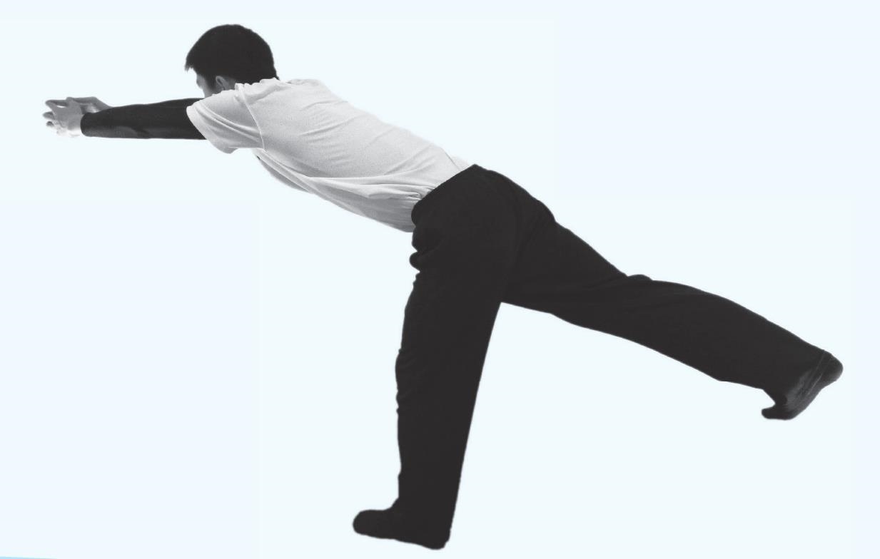身体直立,左腿屈膝抬起,尽量做到小腿与地面平行,右手辅助抓住左脚。身体姿态平衡时保持3~5个呼吸。