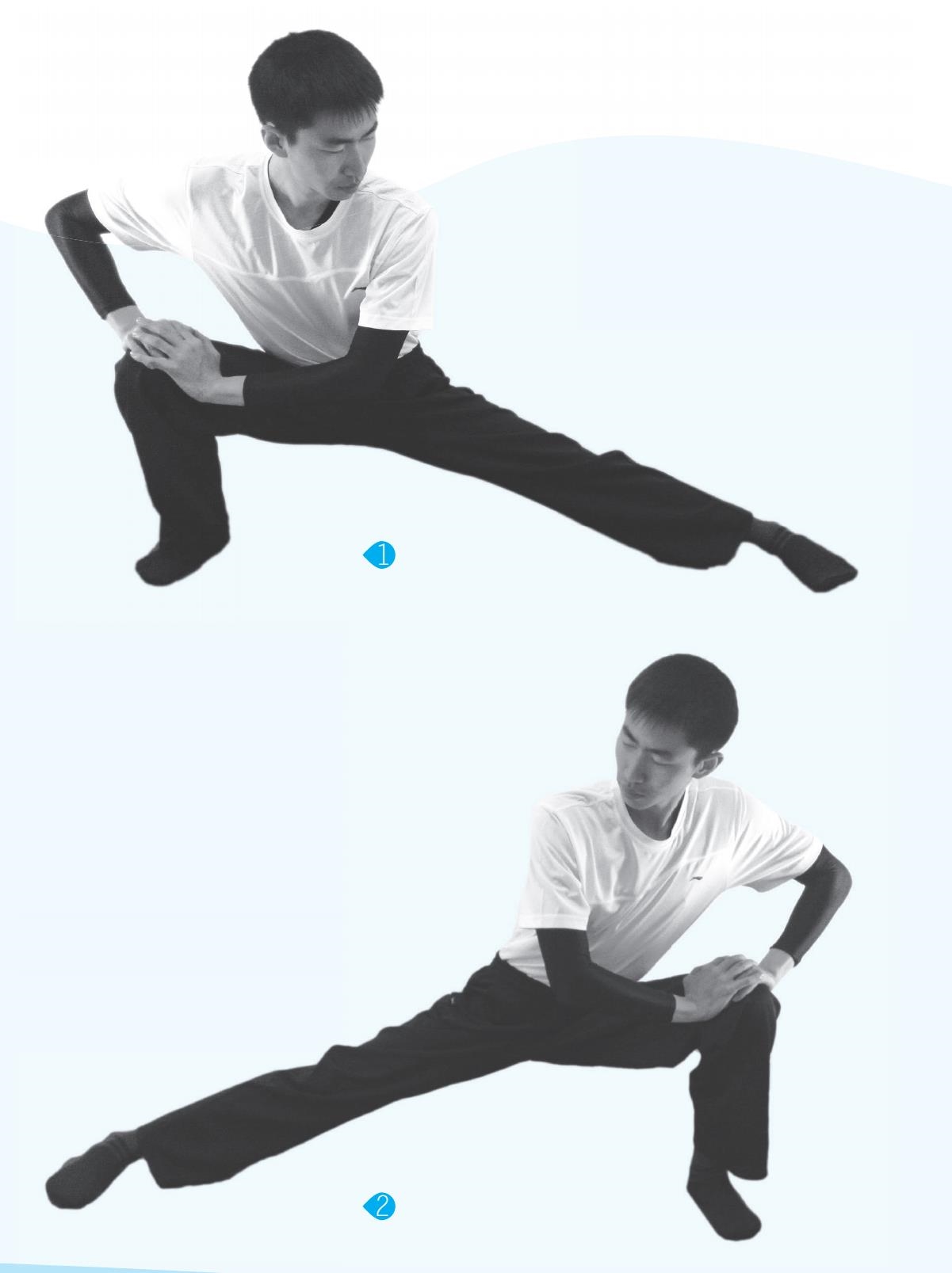 下蹲,屈右膝伸直左腿,成压腿姿势,身体平衡状态下保持3~5个呼吸。