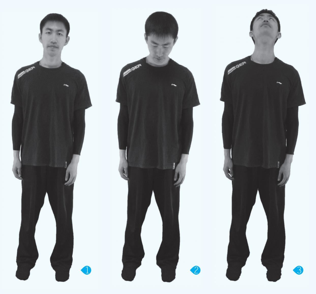 双腿开立,头慢慢底下,至极限位置保持3~5个呼吸;再慢慢仰头,至极限位置保持3~5个呼吸。