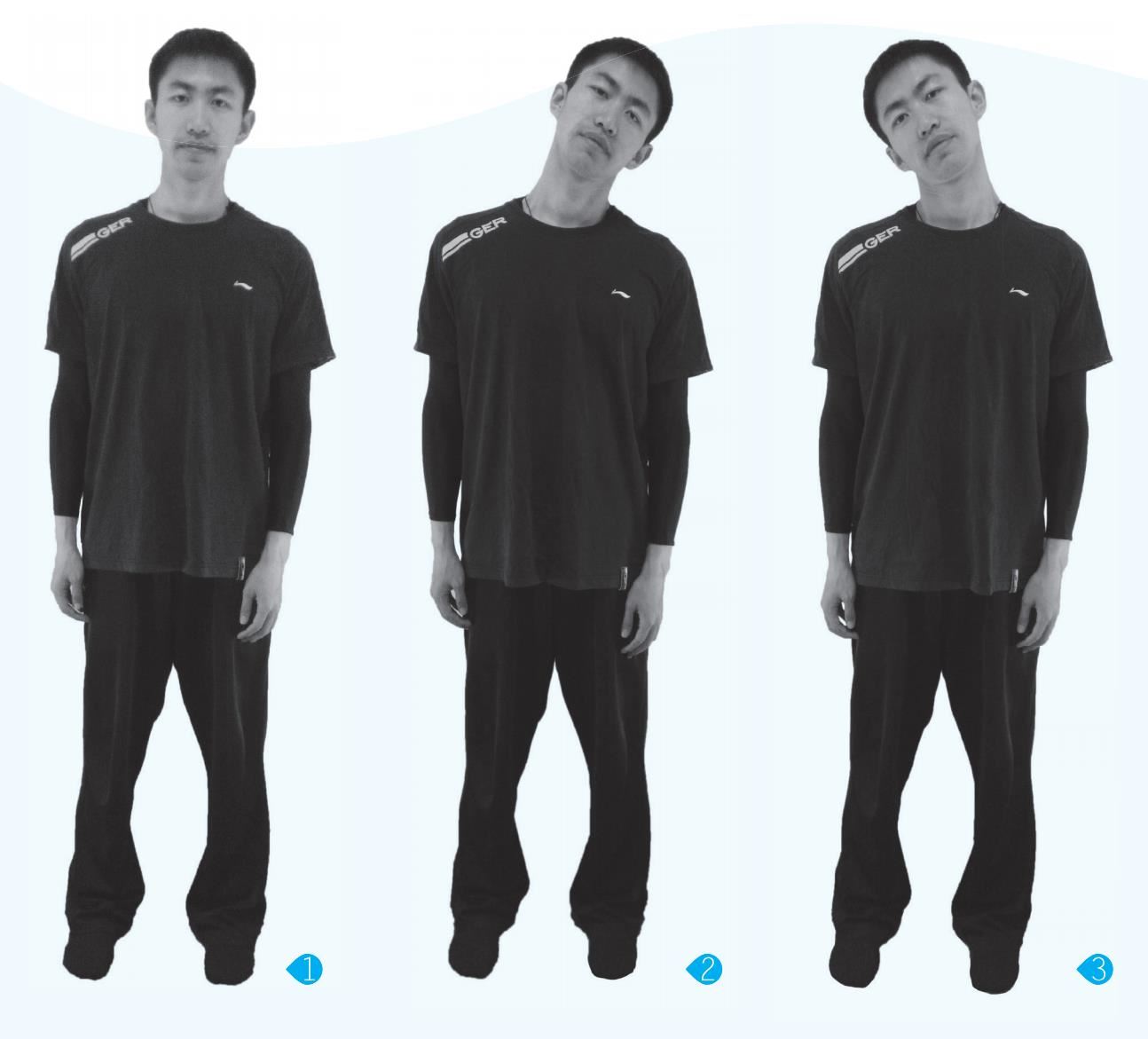 双腿开立,头慢慢向左倾倒,至极限位置保持3~5个呼吸;再慢慢向右倾倒,至极限位置保持3~5个呼吸。
